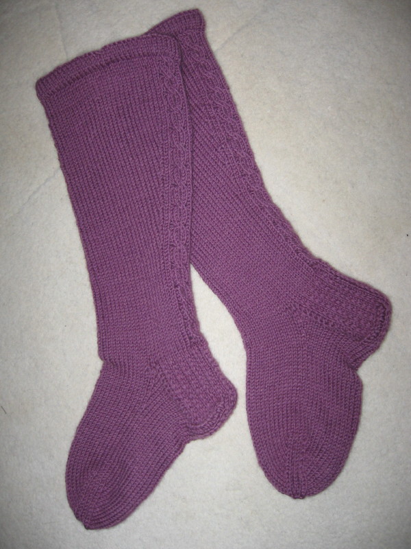 Näitä sukkia varten opettelin tekemään palmikoita. Sukkien malli on muuten sama, kuin aiemmissa siniharmaissa polvisukissa, mutta lisäsin taakse palmikot. Joululahjaksi annettu. Puikot nro. 3, lanka seiskaveikkaa.